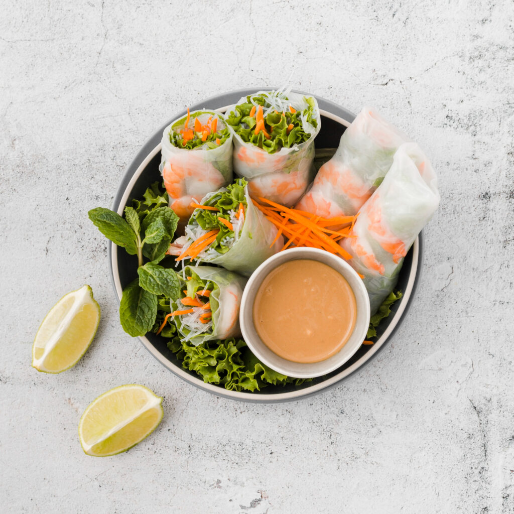 mit Glasnudeln, frischem Salat, Erdnüssen, asiatische Kräutern und Limettendressing mit Röstzwiebeln