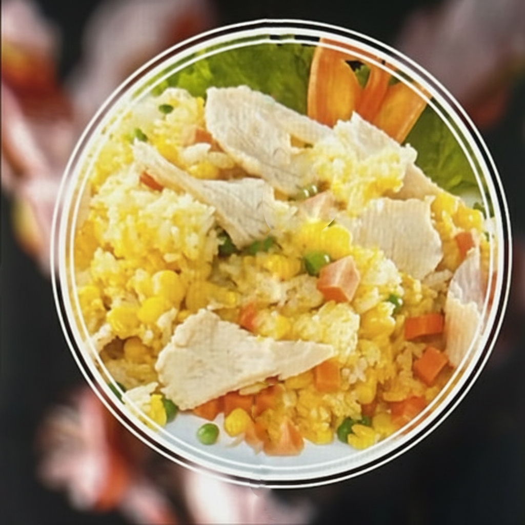 Gebratener Reis mit Eiern, Maiskörnern, Gemüse, Sojasprossen, Lauchzwiebeln, Erdnüssen, Röstzwiebeln mit